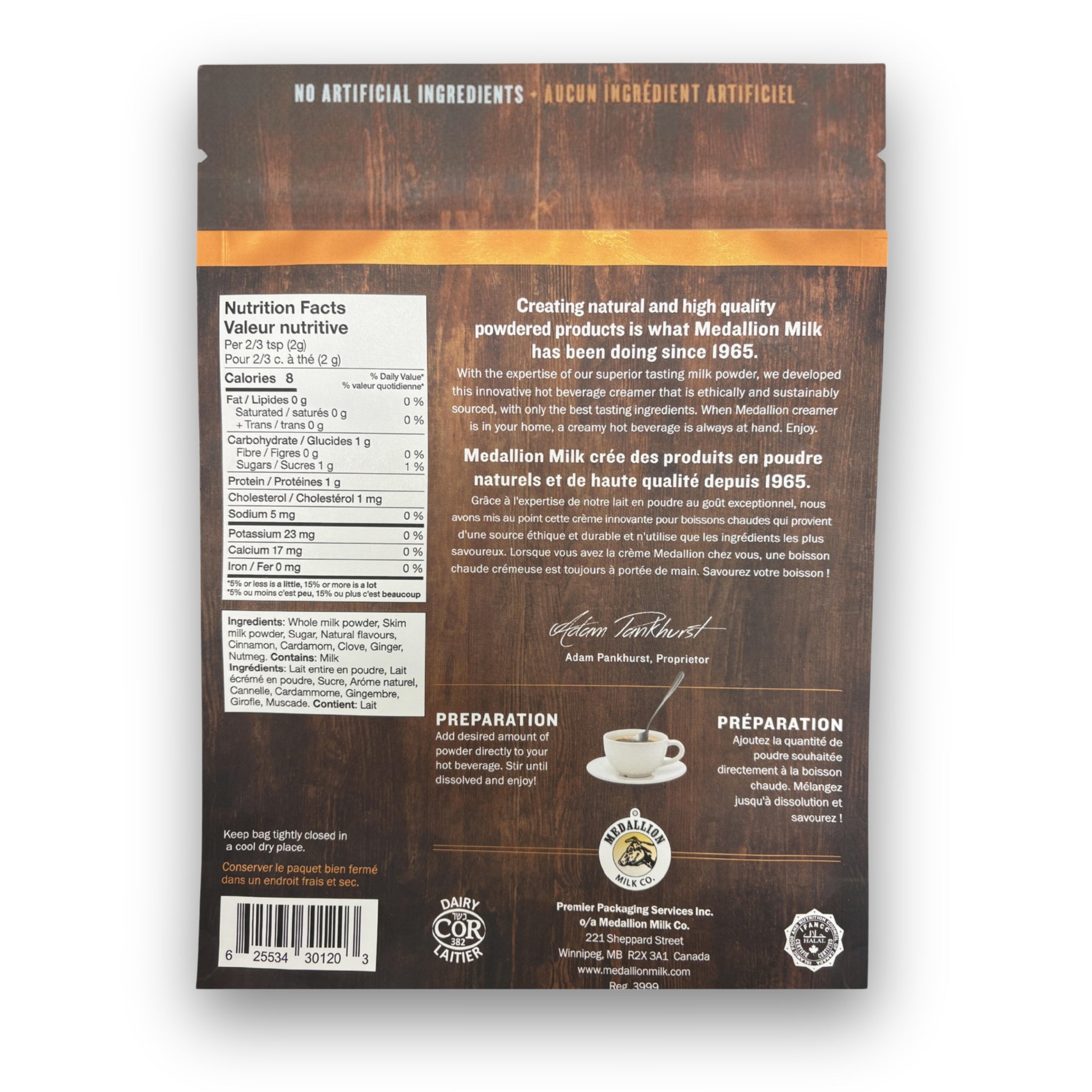 Whole Milk Powder, Skim Milk Powder, Sugar, Natural Flavours, Cinnamon, Cardamom, Clove, Ginger, Nutmeg